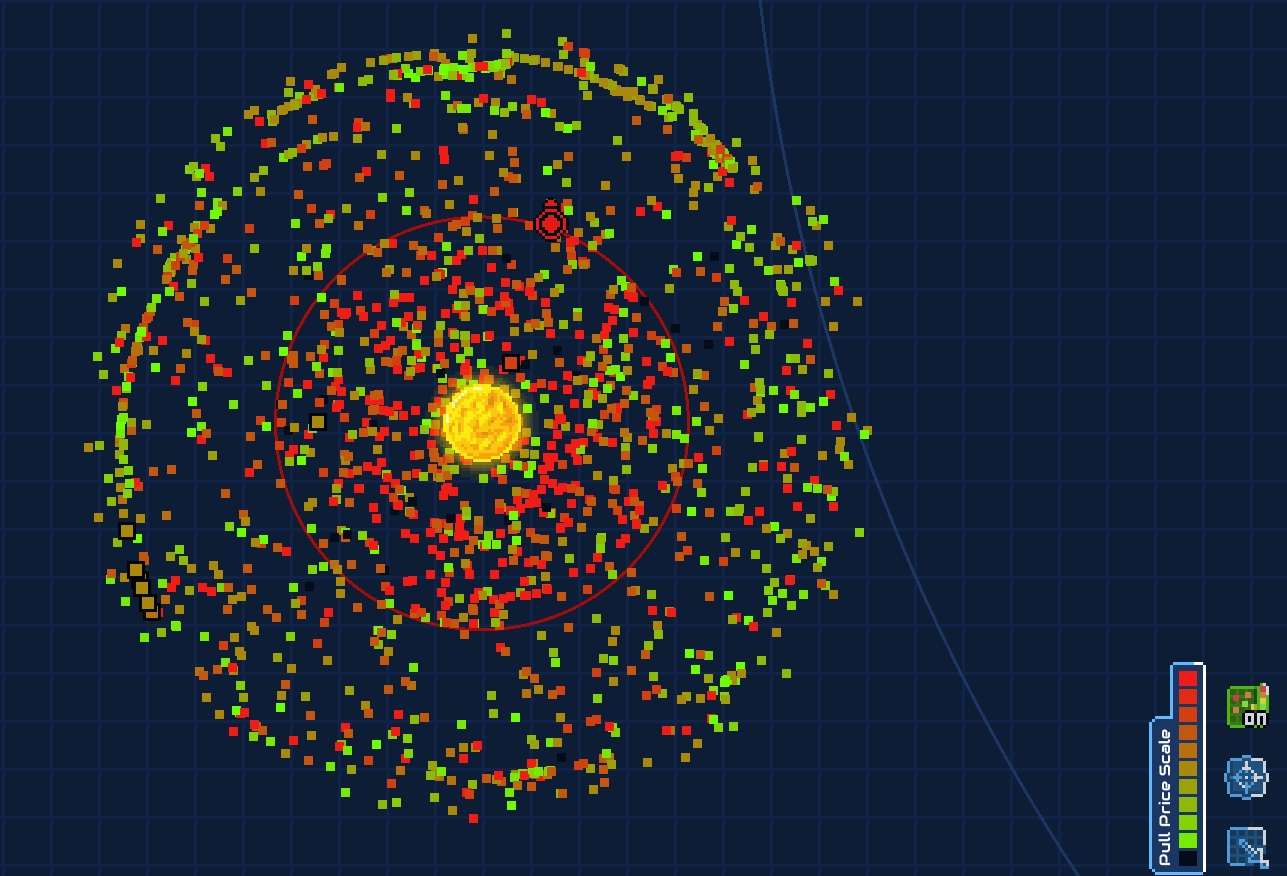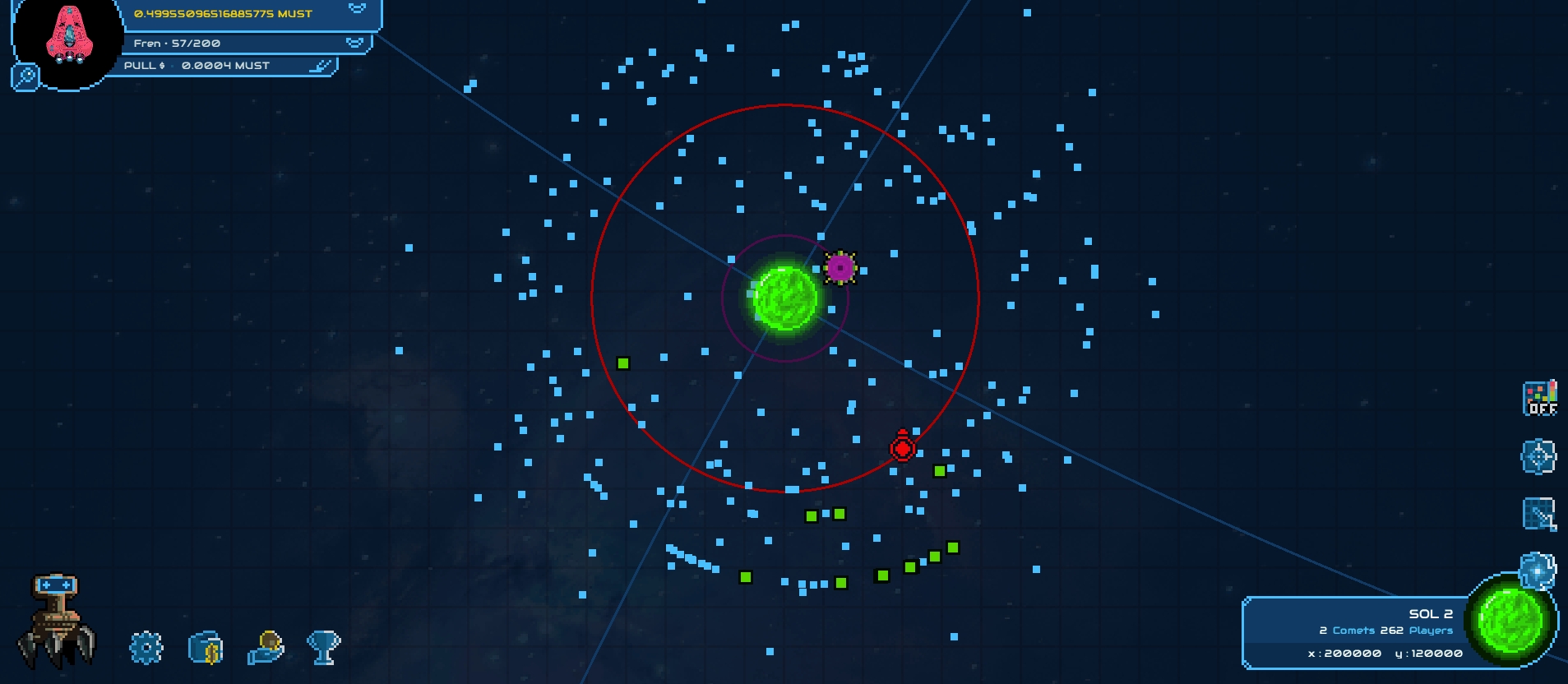 Vous pouvez activer et désactiver le mode tactique en cliquant sur l'icône en bas à gauche, il s'agit d'un outils très important vous permettant de visualiser le prix de pull des vaisseaux alentours. ANTI COMETE FLOOD: Pendant un temps donné après chaque minage (4 secondes par défaut), la récompense de minage est diminuée (5% de réduction par défaut) jusqu'à une réduction maximale (50% par défaut). Il s'agit d'éviter les «paquets de vaisseaux» et les minages excessifs de comètes à un moment donné dans l'espace et dans le temps.