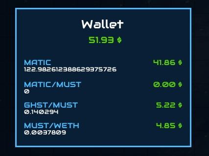 Sur cette comète, vous pourrez miner des GHST/MUST LP tokens. ''Reward 0.0035'' est la somme de Lp token que vous récoltez avec un vaisseau possédant 100% de mining power. ''Remain 12.67'' est le nombre de Lp tokens restant disponible dans la comète