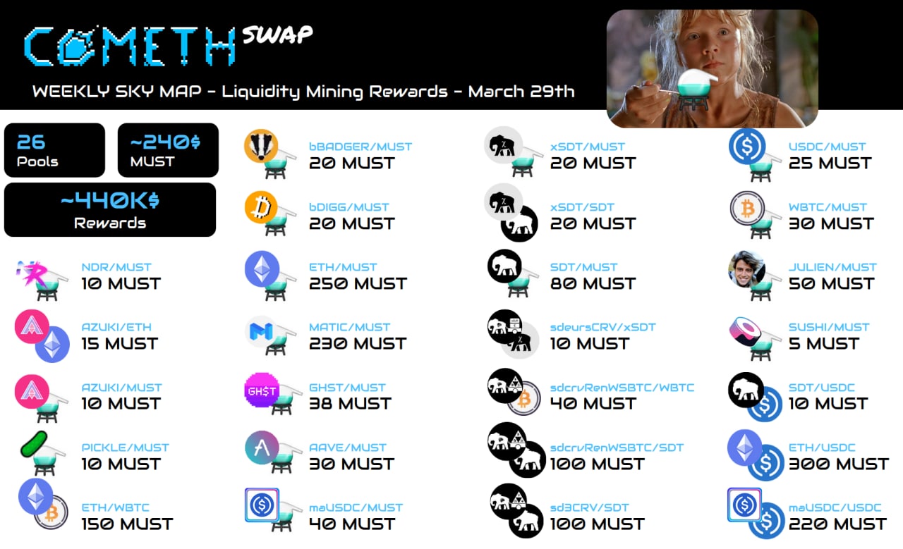 Comethswap est un exchange décentralisé ouvert (DEX) ou tout le monde peut lister une paire ERC20 compatible. Dans le but d'attirer des liquidités sur Comethswap des récompenses en MUST ⚗️ sont redistribuées chaque semaine pour remercier les liquidités providers.